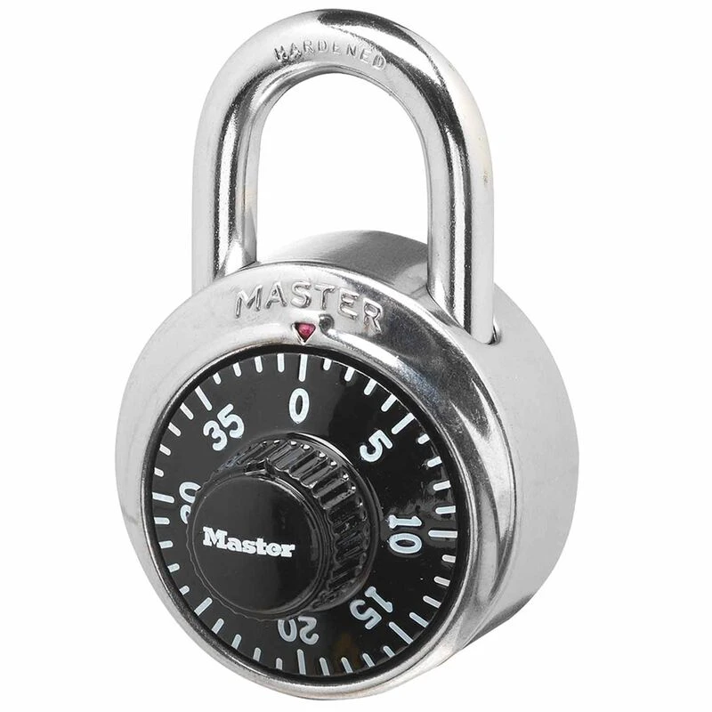 The Master Lock No. 1500D Standard Dial Combination Padlock features a 1 7/8in (48mm) wide metal body for durability, with a stainless steel cover.