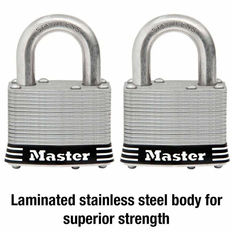 The Master Lock No. 5SST Stainless Steel Padlocks feature a 2in (51mm) wide laminated stainless steel body for maximum strength, reliability, and weather resistance.