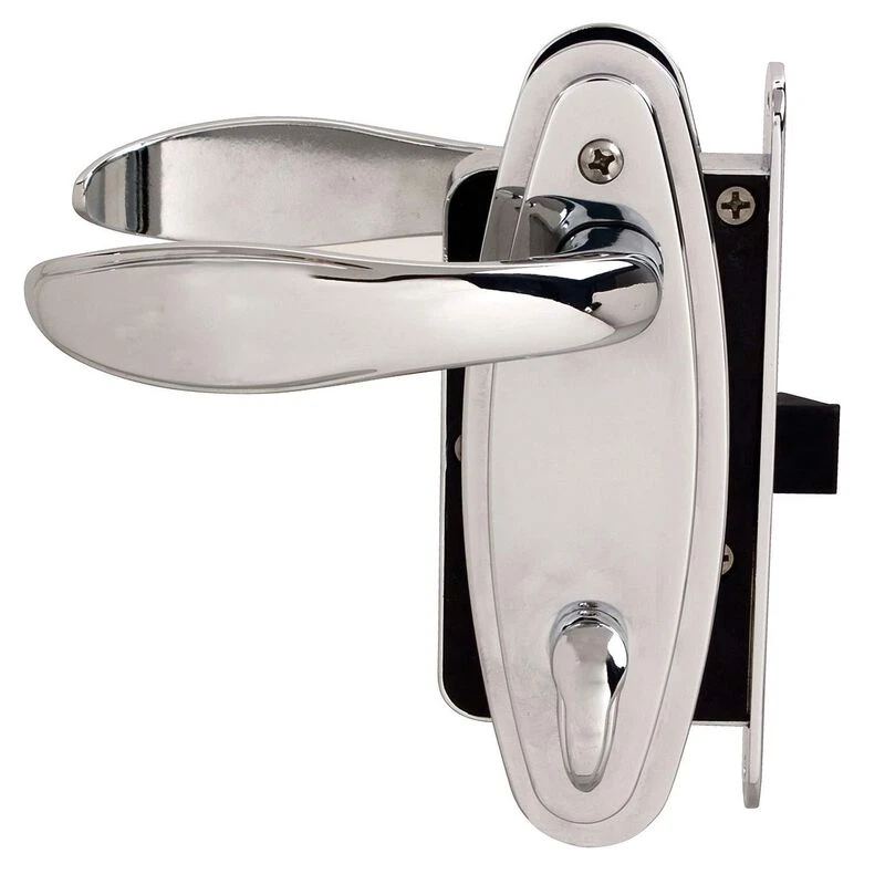 The Mortise Latch Set is a privacy latch for interior cabins and head enclosures. With crome-plated brass and zinc alloy construction, the latch set features two escutcheon plates, contemporary styling, safety unlock from outside, an interior lock mechanism and interchangeable bevels. Locks by turn button from inside. Bevels are Interchangeable.