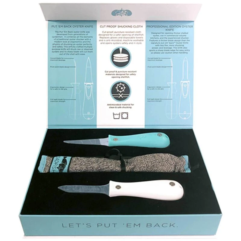 - Put ‘Em Back Oyster Knife – A fresh look at ergonomics with a bent tip design and handles made from recycled plastic bottles. Opens oysters with ease.