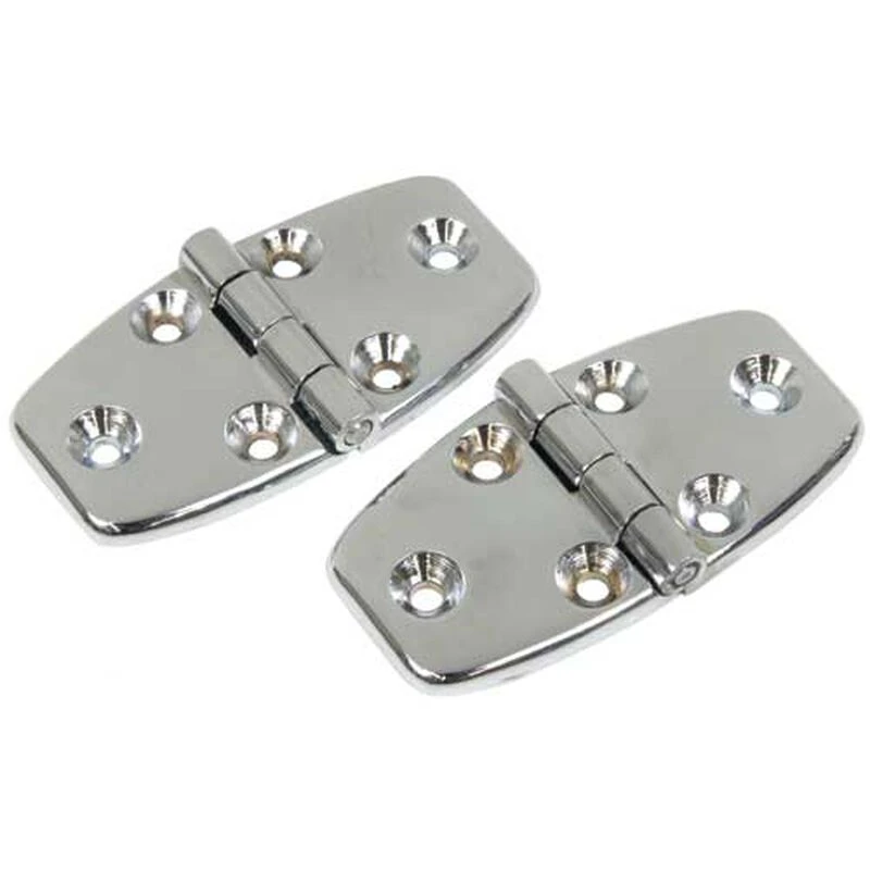 These exclusive utility hinges are designed to be surface mounted and provide a finished look. The cast 304 stainless steel gives the hinge a stout appearance while the polished finish offers a detailed look that will compliment interior cabinetry or exterior hardware. Drilled and counter-sunk for oval or flat head screws, these hinges surface mount easily and give users the ability to easily align doors and hatches.